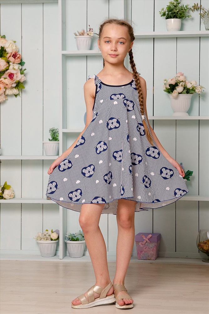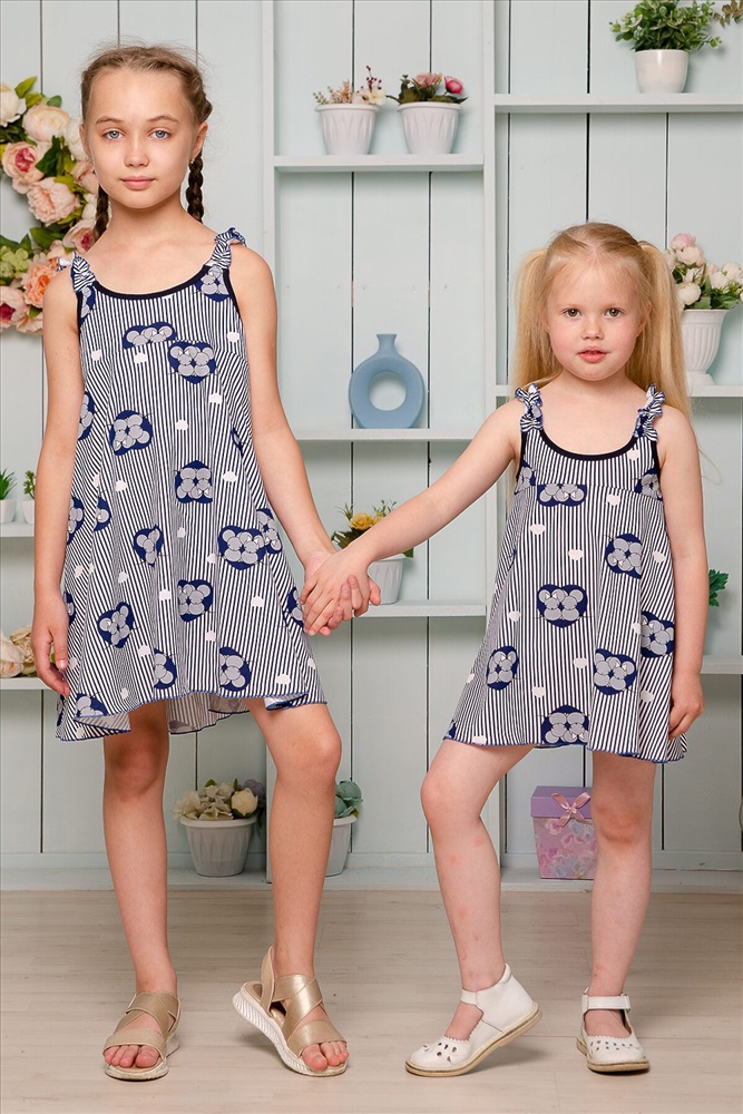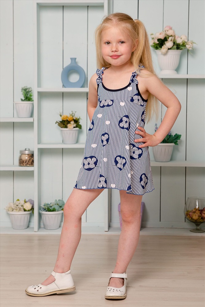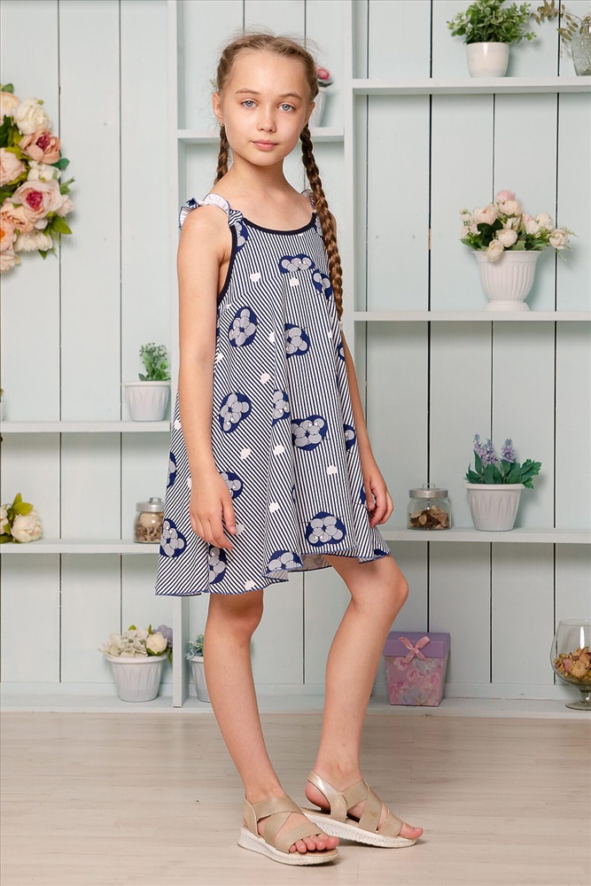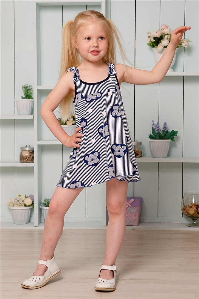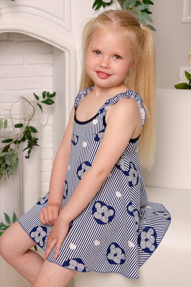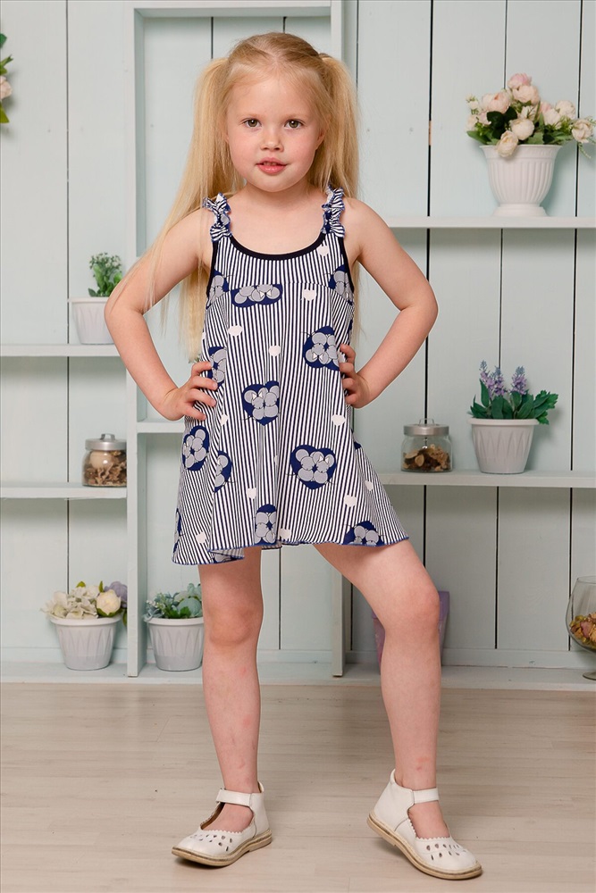 Страна производства: Россия Сарафан детский летний, свободного силуэта с завышенной линией талии. Бретели выполнены из основной ткани собранной на тонкую резинку. Низ изделия обработан декоративной краеобметочной строчкой.