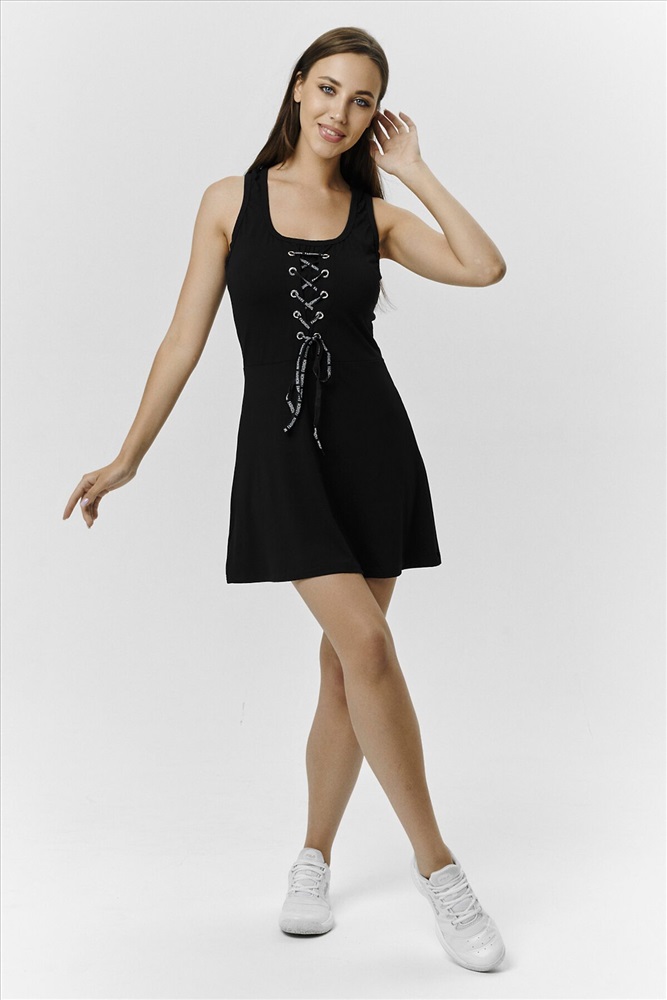 Страна производства: Россия Сарафан женский приталенного силуэта, полочка оформлена люверсами с декоративным шнурком.