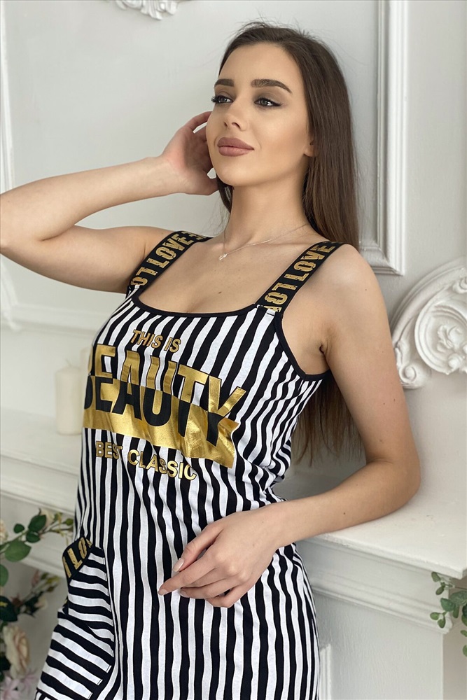 ID товара: 675048 Состав: 100% Хлопок Сезон: Весна/Лето Длина: До колена Фасон: Прямой Рукав: Без рукавов Рисунок: Полоски Основная ткань: Хлопок | Кулирка Стиль: Повседневный Страна бренда: Россия Страна производства: Россия Сарафан на бретелях из широкой резинки с принтом, полуприлегающего силуэта, с фигурным низом, с одним накладным карманом, средней длины. Проймы, горловина и низ обработаны бейкой из отделочного полотна. Комментарии к товару
