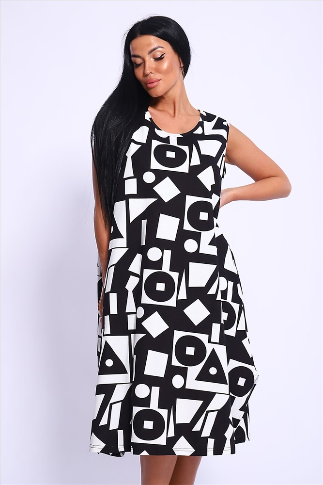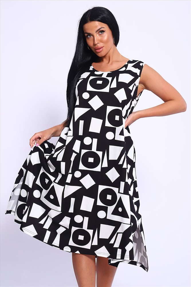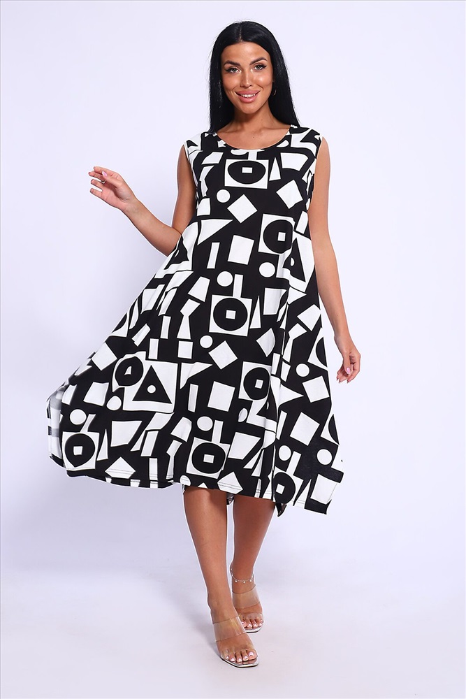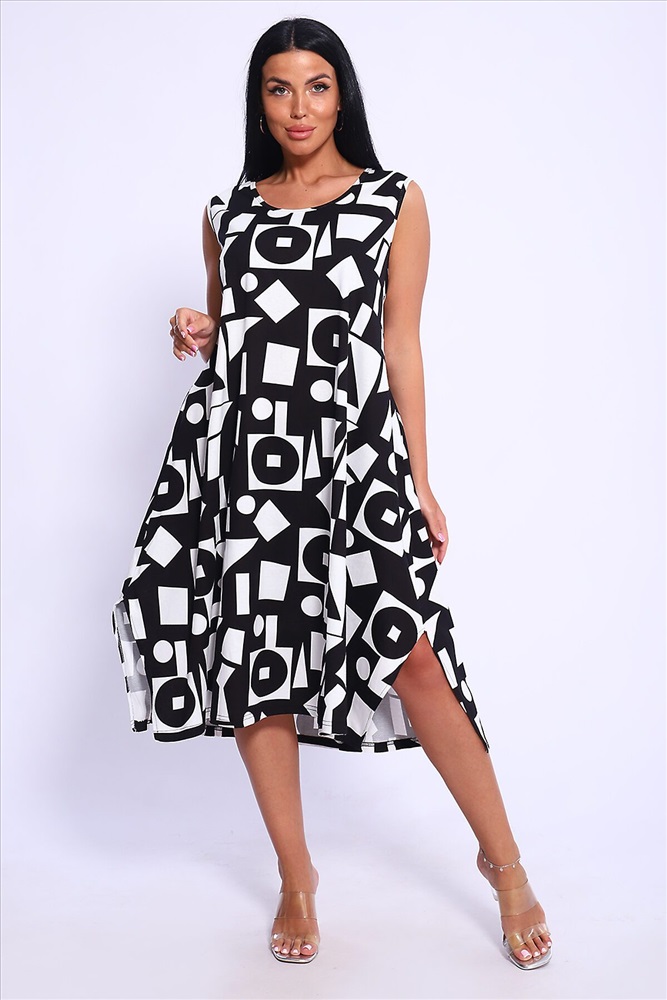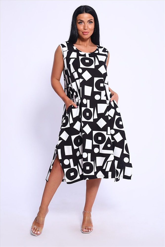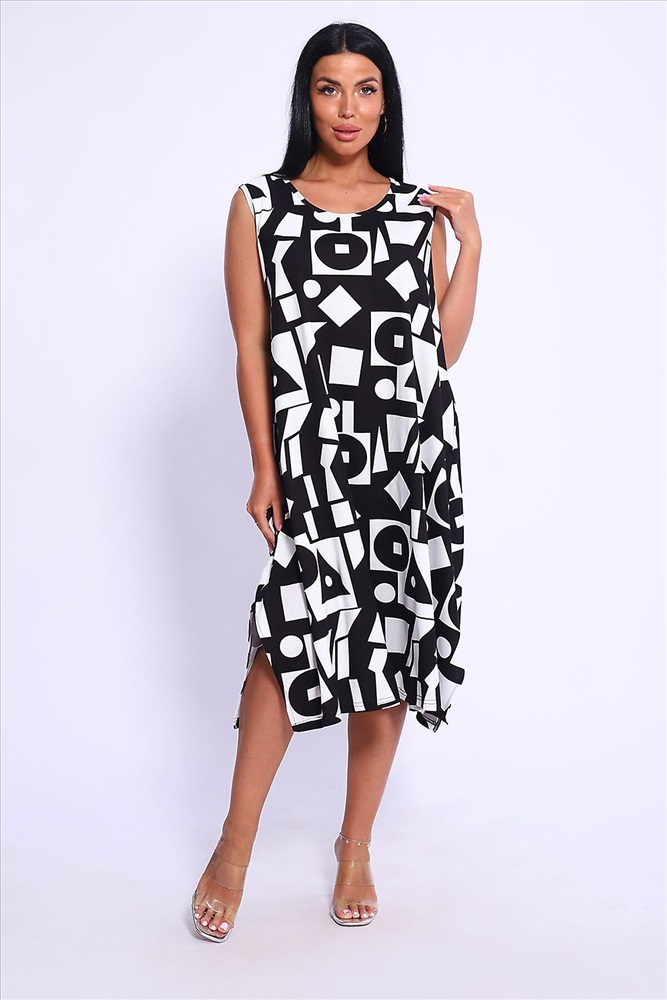 ID товара: 1015614 Состав: 100% Хлопок Сезон: Весна/Лето Длина: Миди Фасон: А-силуэт Рукав: без рукавов Вырез горловины: Округлый Рисунок: Абстракция Декоративные элементы: Разрезы Основная ткань: Хлопок Стиль: повседневный Вид ткани: Кулирка Страна бренда: Россия Страна производства: Россия Повседневный длинный сарафан выполнен из трикотажного полотна, комфортный и мягкий на ощупь. Платье-сарафан на широких лямках подходит под разные типы фигур, трапециевидный А-силуэт и карманы в боковом шве будет удобен для полных и для беременных девушек. Подол сарафана свободного кроя . Сарафан идеален для повседневной носки, пляжного отдыха или вечеринки на природе. На модели представлен 50 размер. Параметры модели 165 см, 97-71-101 В таблице замеров в параметре обхват бедер представлен замер низа изделия. Комментарии к товару