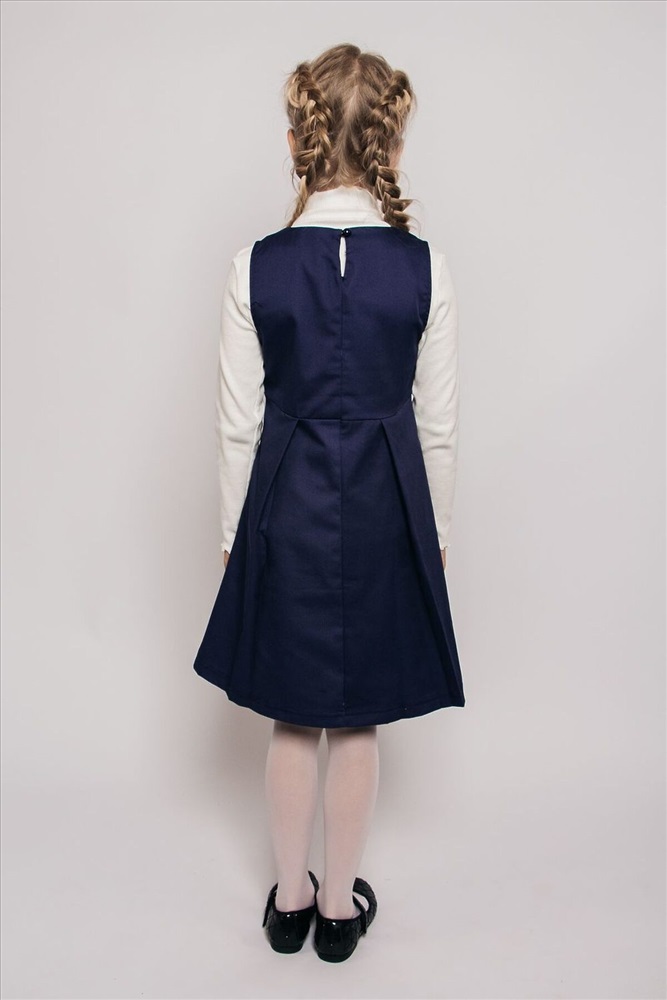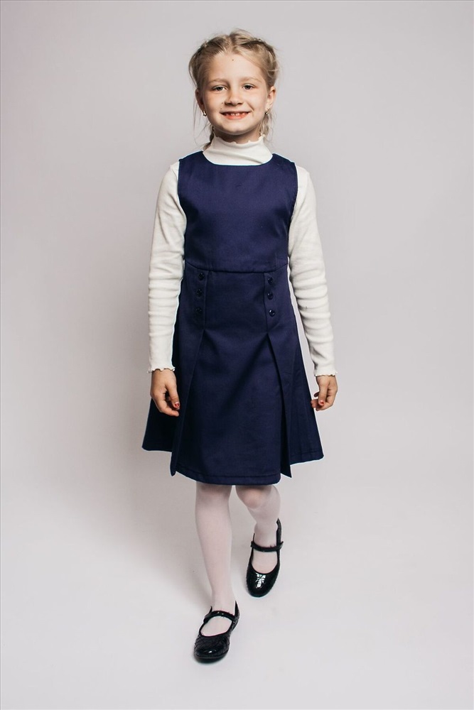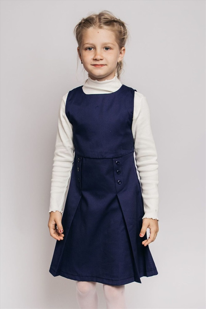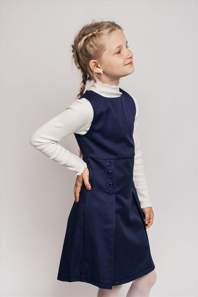 Сарафан для девочки приталенного силуэта. Горловина круглая, на полочки и спинки внутри обработана обтачкой из основного полотна, в цвет изделия. Обтачки по горловине проклеена дублерином на трикотажной основе. По спинке средний шов с вырезом. Застежка - в виде петли на спинке, пуговица на ножке. В левом боковом шве потайной замок, в цвет изделия. По линии складки пришиты пуговицы. Юбка расклешенная, со складками по линии талии. Низ изделия обработан швом в подгибку.
