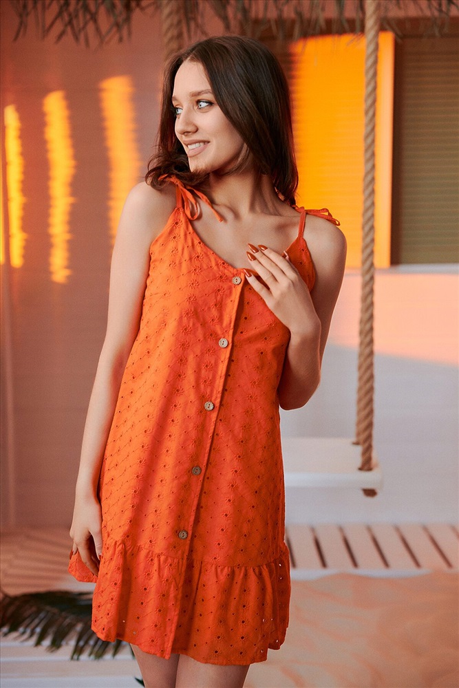 Страна производства: Россия Сарафан трапециевидного силуэта, на тонких бретелях с возможностью регулировки, с V-образной горловиной на полочке и спинке, с застежкой на пуговицы и петли. Низ сарафана завершен оборкой. Внутри сарафан на хлопковой подкладке, благодаря которой верхний слой ткани не просвечивает