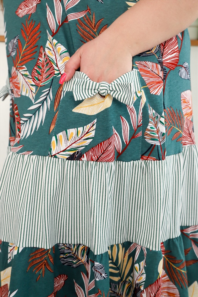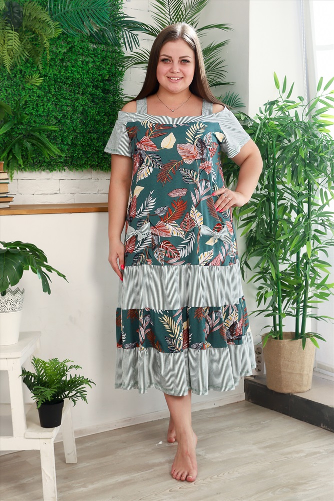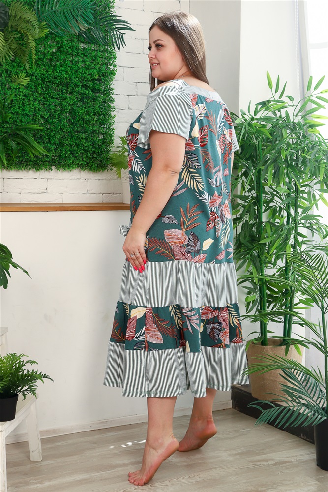 Застежка: без застежки Сарафан женский, к низу расширенный. Низ платья из трех ярусов на небольшой сборке. На полочке два накладных кармана с завязками. Обтачка верха, бретели, короткие рукава, обтачки карманов и два яруса сарафана из ткани в тонкую полоску, что придает изделию особую неповторимость и актуальность. На модели 52 размер