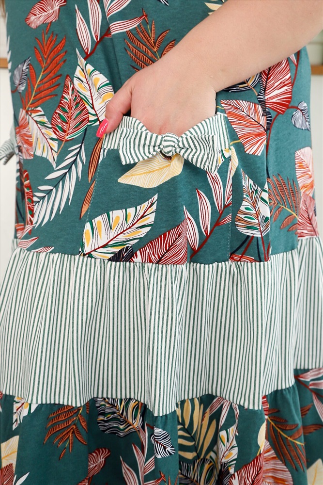 Сарафан женский, к низу расширенный. Низ платья из трех ярусов на небольшой сборке. На полочке два накладных кармана с завязками. Обтачка верха, бретели, короткие рукава, обтачки карманов и два яруса сарафана из ткани в тонкую полоску, что придает изделию особую неповторимость и актуальность. На модели 52 размер