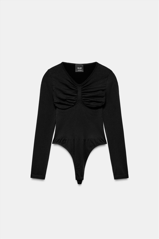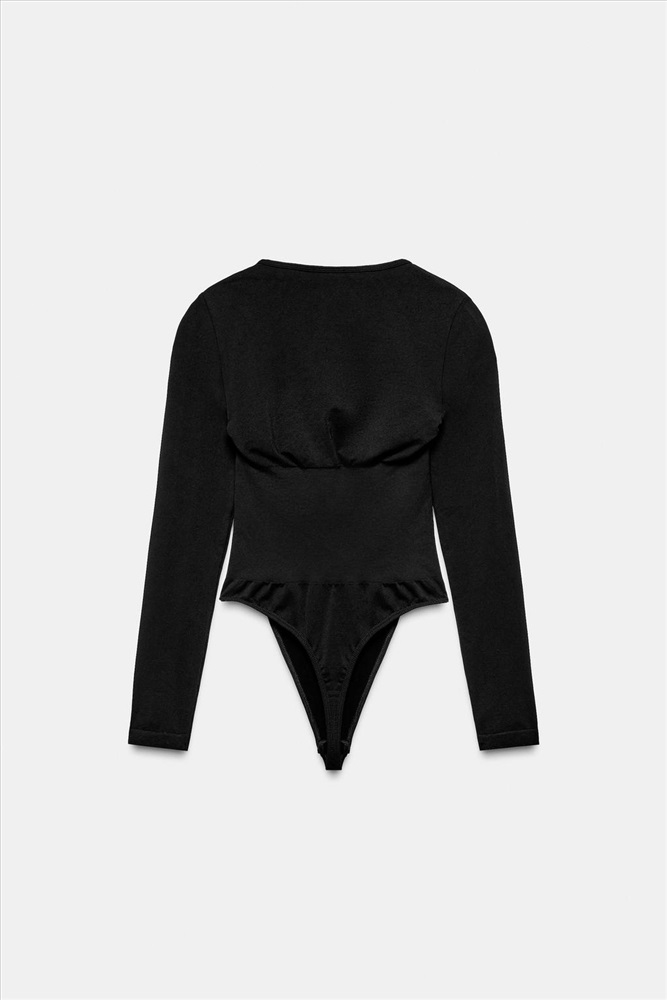 Close-fitting, lightweight bodysuit with a soft feel. V-neck with gathers on the chest that enhance the silhouette and long sleeves. Snap-button fastening at the bottom.