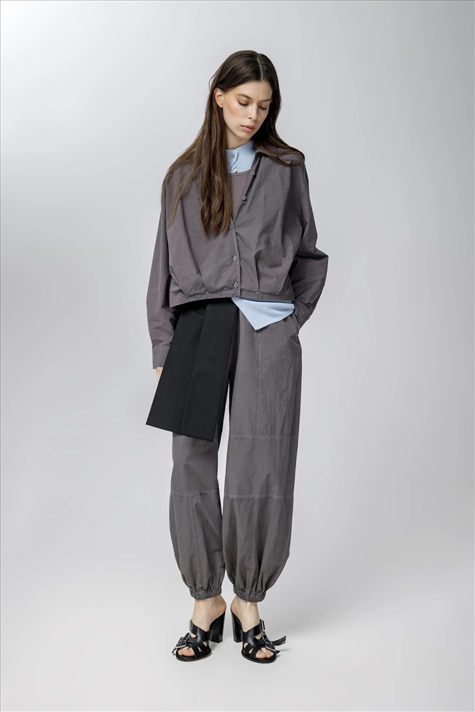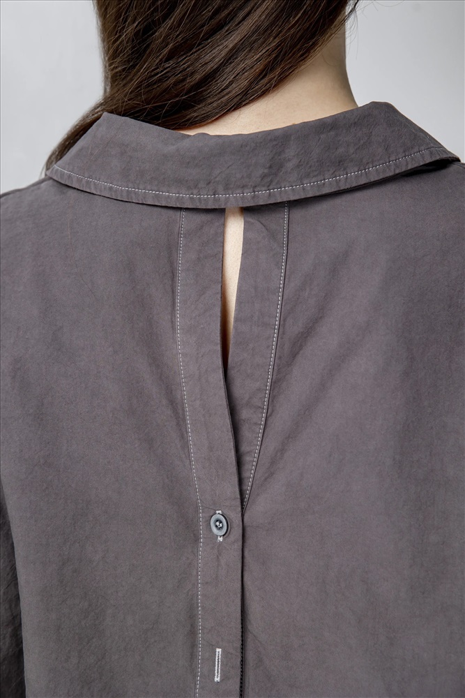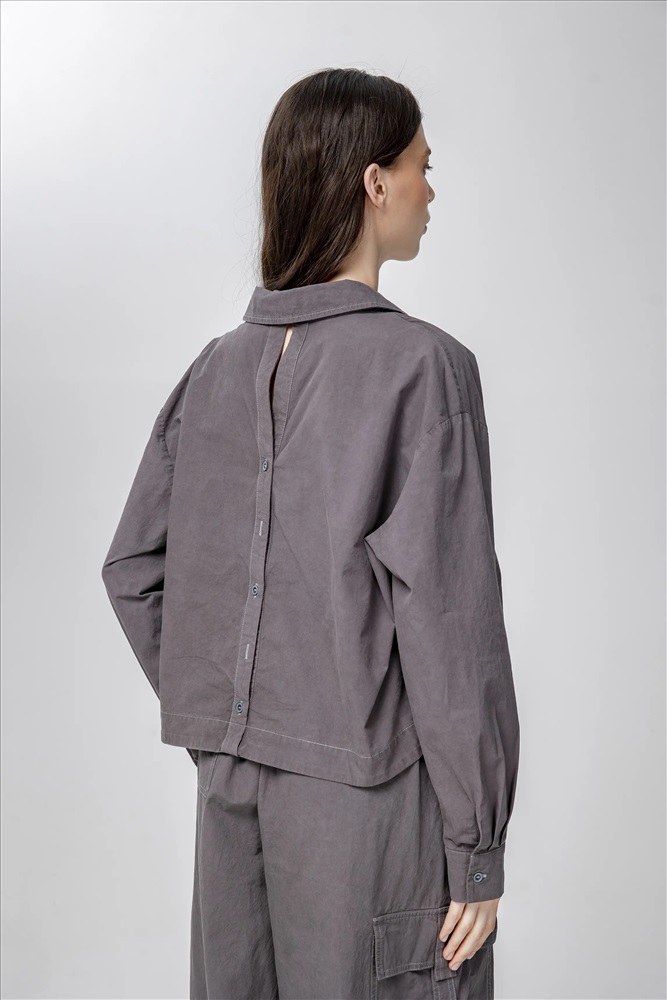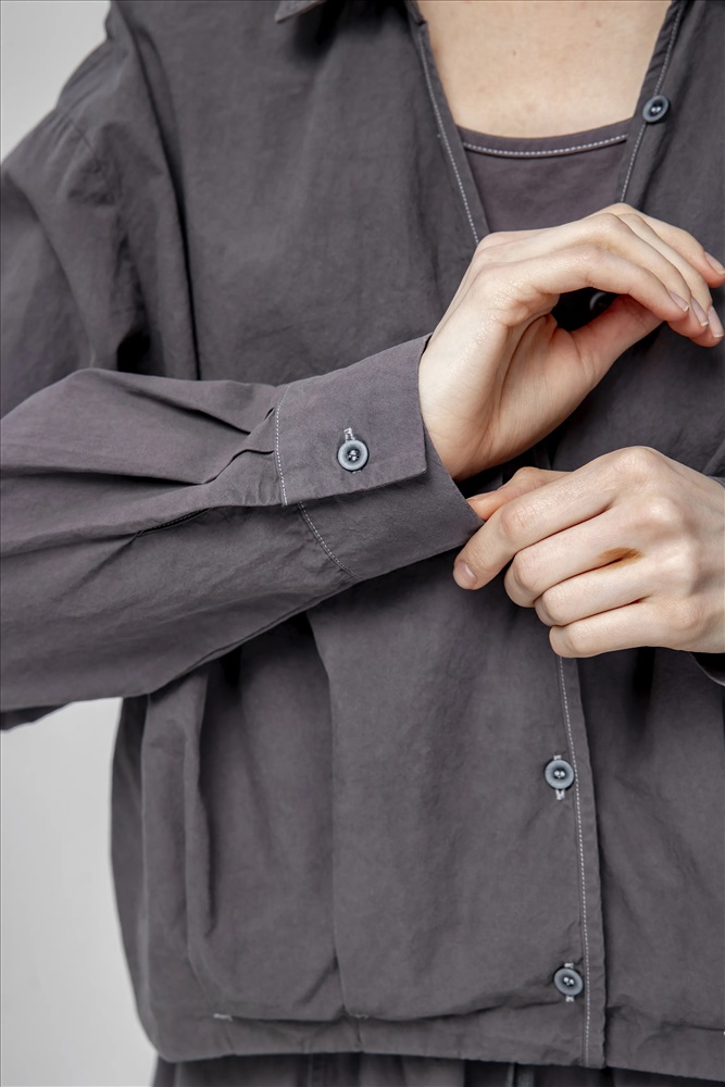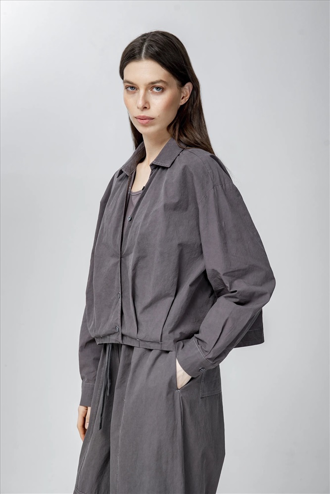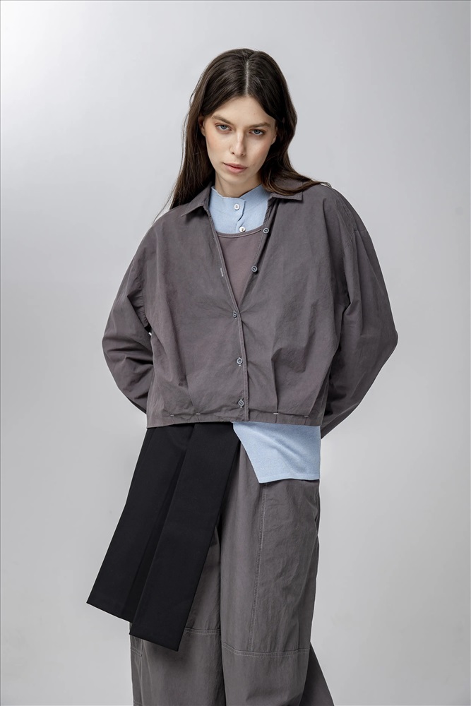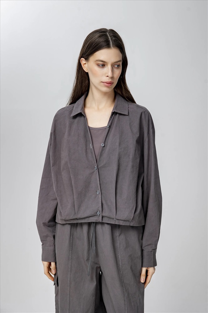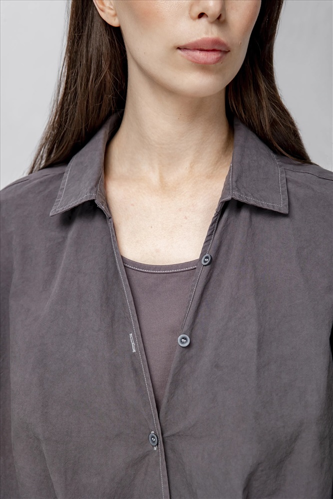 Блузка регулярного силуэта, укороченная, с встроенным топом и отложным воротником. Линия плеча спущена. Манжеты с шлицами застегиваются на пуговицы. По передней части изделия застежка на пуговицы. По низу эластичная резинка. В составе верхнего слоя 100% хлопок. В составе нижнего слоя хлопок, полиэстер и спандекс. Представлена в сером цвете с белым топом.