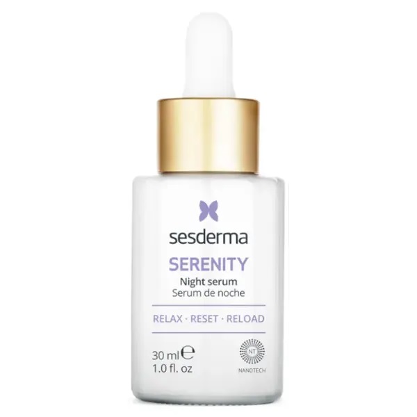 Sérum facial de la nueva línea de Sesderma, Serenity, que actúa mientras duermes para lucir una piel radiante y fresca por la mañana.