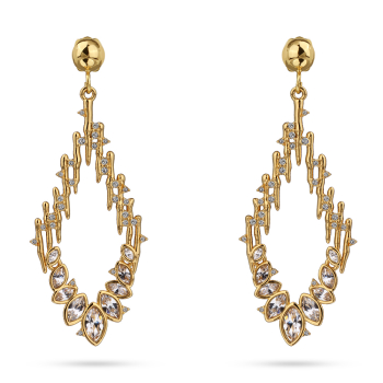 Изготовлено из ювелирного сплава на основе латуни с гальваническим покрытием золотом. Изделие украшают кристаллы SW белого цвета. Размер серьги 7х3.2см. Застежка-гвоздики.