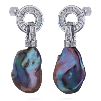 Изготовлено из ювелирного сплава на основе латуни с гальваническим покрытием родием. Изделие украшают бензиновый жемчуг и белый фианит Размер 4.5х1.5см. Застежка-гвоздики.*Цвет и форма жемчужин может отличаться от изображенной на фото.