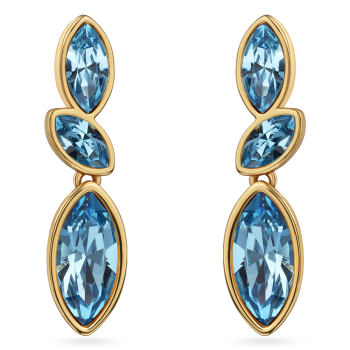 Изготовлено из ювелирного сплава на основе латуни с гальваническим покрытием золотом. Изделие украшают кристаллы SW цвета аквамарин. Длина серьги 3.5см. Застежка-гвоздики.