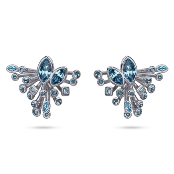 Изготовлено из ювелирного сплава на основе латуни с гальваническим покрытием родием. Изделие украшают кристаллы SW цвета аквамарин. Размер серьги 3х2.5см. Застежка-гвоздики.