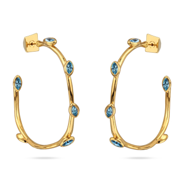 Изготовлено из ювелирного сплава на основе латуни с гальваническим покрытием золотом. Изделие украшают кристаллы SW цвета аквамарин. Диаметр серьги 5см. Застежка-гвоздики.