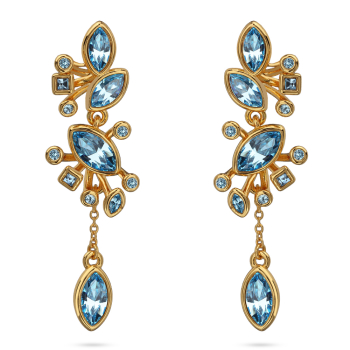 Изготовлено из ювелирного сплава на основе латуни с гальваническим покрытием золотом. Изделие украшают кристаллы SW цвета аквамарин. Размер серьги 5.5х1.5см. Застежка-гвоздики.