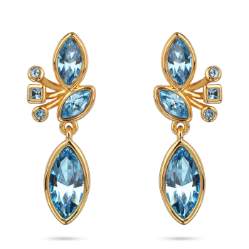 Изготовлено из ювелирного сплава на основе латуни с гальваническим покрытием золотом. Изделие украшают кристаллы SW цвета аквамарин. Размер серьги 4х1.5см. Застежка-гвоздики.