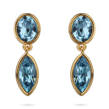Изготовлено из ювелирного сплава на основе латуни с гальваническим покрытием золотом. Изделие украшают кристаллы SW цвета аквамарин. Размер серьги 3.5х1см. Застежка-гвоздики.