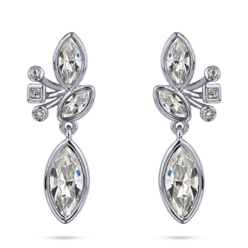 Изготовлено из ювелирного сплава на основе латуни с гальваническим покрытием родием. Изделие украшают кристаллы SW белого цвета. Размер серьги 4х1.5см. Застежка-гвоздики.