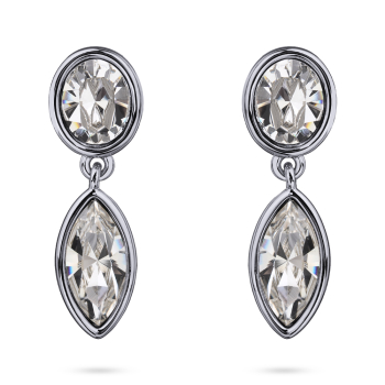Изготовлено из ювелирного сплава на основе латуни с гальваническим покрытием родием. Изделие украшают кристаллы SW белого цвета. Размер серьги 3.5х1см. Застежка-гвоздики.