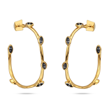 Изготовлено из ювелирного сплава на основе латуни с гальваническим покрытием золотом. Изделие украшают кристаллы SW темно-серого цвета. Диаметр серьги 5см. Застежка-гвоздики.
