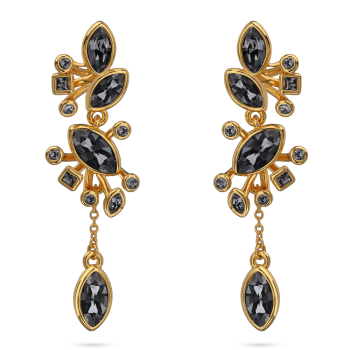 Изготовлено из ювелирного сплава на основе латуни с гальваническим покрытием золотом. Изделие украшают кристаллы SW темно-серого цвета. Размер серьги 5.5х1.5см. Застежка-гвоздики.
