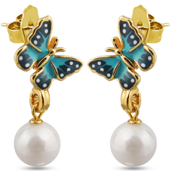 Изготовлено из ювелирного сплава на основе латуни с гальваническим покрытием золотом. Изделие украшают голубая и темно-синяя эмаль, нанесенная вручную и белый жемчуг диаметром 10мм. Застежка-гвоздики. Длина 1.5см.