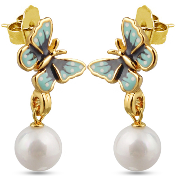 Изготовлено из ювелирного сплава на основе латуни с гальваническим покрытием золотом. Изделие украшают мятная и серая эмаль, нанесенная вручную и белый жемчуг диаметром 10мм. Застежка-гвоздики. Длина 1.5см.