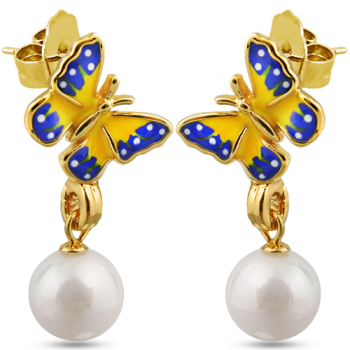 Изготовлено из ювелирного сплава на основе латуни с гальваническим покрытием золотом. Изделие украшают желтая и синяя эмаль, нанесенная вручную и белый жемчуг диаметром 10мм. Застежка-гвоздики. Длина 1.5см.