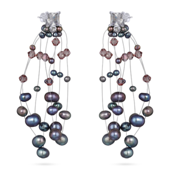 Изготовлено из ювелирного сплава на основе латуни с гальваническим покрытием родием. Изделие украшают бензиновый жемчуг диаметром 3-7мм и кристаллы SW аметистового цвета размером 7х7мм. Длина серьги 6, 5см.