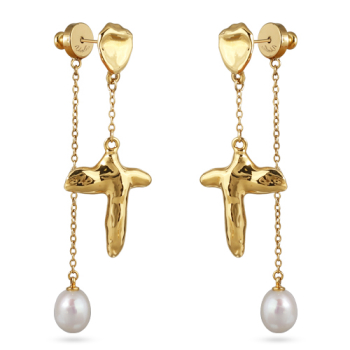 Изготовлено из ювелирного сплава на основе латуни с гальваническим покрытием золотом. Изделие украшает натуральный жемчуг белого цвета диаметром 8-9мм. Длина серьги 6.5см. Застежка-гвоздики.