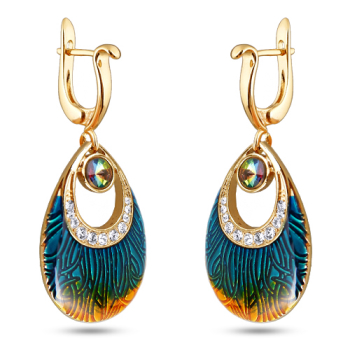 Изготовлено из ювелирного сплава на основе латуни с гальваническим покрытием золотом. Изделие украшают кристаллы SW белого и зеленого хамелеон цвета, зеленая и желтая эмаль. Размер серьги 5х2см. Английская застежка.