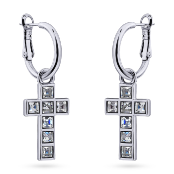 Изготовлено из ювелирного сплава на основе латуни с гальваническим покрытием родием. Изделие украшают кристаллы SW белого цвета. Размер серьги 4.2х1.5см. Застежка-хупы.