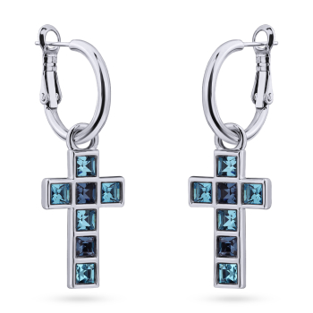 Изготовлено из ювелирного сплава на основе латуни с гальваническим покрытием родием. Изделие украшают кристаллы SW цвета джинс и аквамарин. Размер серьги 4.2х1.5см. Застежка-хупы.