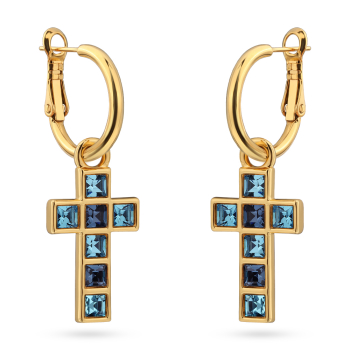 Изготовлено из ювелирного сплава на основе латуни с гальваническим покрытием золотом. Изделие украшают кристаллы SW цвета джинс и аквамарин. Размер серьги 4.2х1.5см. Застежка-хупы.