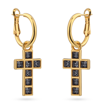 Изготовлено из ювелирного сплава на основе латуни с гальваническим покрытием золотом. Изделие украшают кристаллы SW темно-серого цвета. Размер серьги 4.2х1.5см. Застежка-хупы.