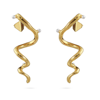 Изготовлено из ювелирного сплава на основе латуни с гальваническим покрытием золотом. Изделие украшает жемчуг Майорка белого цвета. Размер серьги 4.5х1, 5см. Застежка-гвоздики.