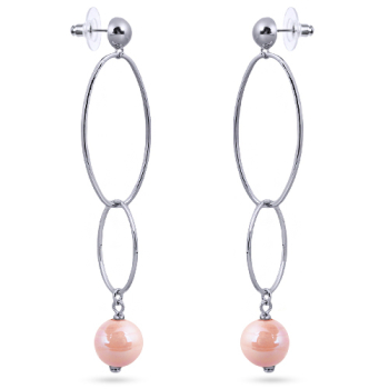 Изготовлено из ювелирного сплава на основе латуни с гальваническим покрытием родием. Изделие украшает майорский круглый жемчуг нежно-персикового цвета диаметром 12мм. Застёжка-гвоздики. Длина 9см.