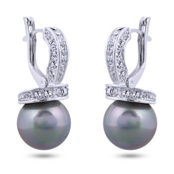 Изготовлено из ювелирного сплава на основе латуни с гальваническим покрытием родием. Изделие украшает майорский круглый жемчуг серо-голубого цвета диаметром 12мм и кубики циркония. Английский замок. Длина серьги 3см.