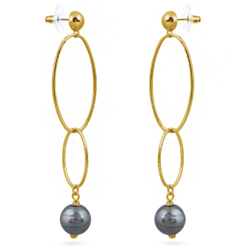 Изготовлено из ювелирного сплава на основе латуни с гальваническим покрытием золотом. Изделие украшает майорский круглый жемчуг серо-голубого цвета диаметром 12мм. Застёжка-гвоздики. Длина 9см.