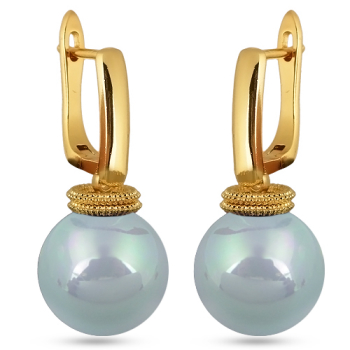 Изготовлено из ювелирного сплава на основе латуни с гальваническим покрытием золотом. Изделие украшает круглый жемчуг Майорка голубого цвета диаметром 14мм. Длина серьги 3.5см. Английская застежка.