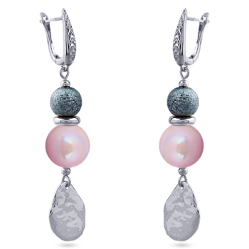 Изготовлено из ювелирного сплава на основе латуни с гальваническим покрытием родием. Изделие украшает круглый майорский жемчуг холодно-розового цвета диаметром 14мм. Длина серьги 7см. Английская застежка.