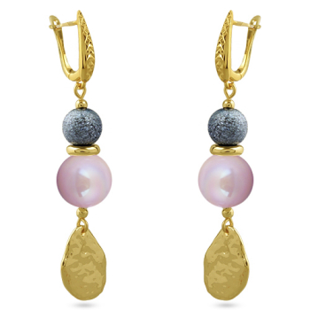 Изготовлено из ювелирного сплава на основе латуни с гальваническим покрытием золотом. Изделие украшает майорский круглый жемчуг холодно-розового цвета диаметром 14мм. Длина серьги 7см. Английская застежка.