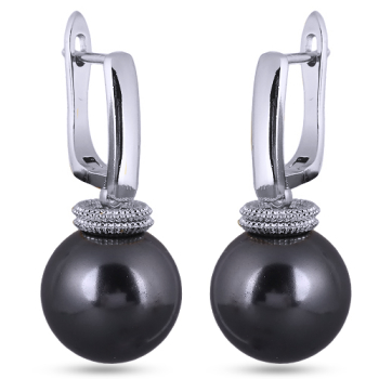 Изготовлено из ювелирного сплава на основе латуни с гальваническим покрытием родием. Изделие украшает круглый жемчуг Майорка темно-серого цвета диаметром 14мм. Длина серьги 3.5см. Английская застежка.