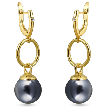 Изготовлено из ювелирного сплава на основе латуни с гальваническим покрытием золотом. Изделие украшает майорский круглый жемчуг темно-серого цвета диаметром 14мм. Длина серьги 4.5см. Английская застежка.