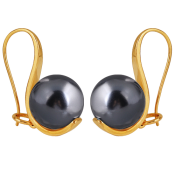 Изготовлено из ювелирного сплава на основе латуни с гальваническим покрытием золотом. Изделие украшает майорский круглый жемчуг темно-серого цвета диаметром 14мм. Длина серьги 3см. Замок-петля.