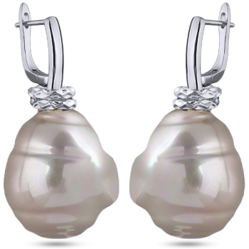 Изготовлено из ювелирного сплава на основе латуни с гальваническим покрытием родием. Изделие украшает барочный жемчуг Майорка цвета шампань диаметром 18мм. Длина серьги 4см. Английская застежка.