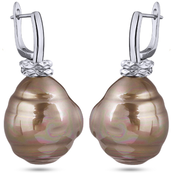 Изготовлено из ювелирного сплава на основе латуни с гальваническим покрытием родием. Изделие украшает барочный жемчуг Майорка золотистого цвета диаметром 18мм. Длина серьги 4см. Английская застежка.
