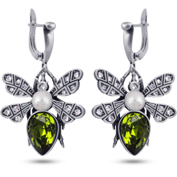 Изготовлено из ювелирного сплава на основе латуни с гальваническим покрытием античным серебром. Изделие украшают кристаллы SW зеленого цвета и белый майорский жемчуг диаметром 6мм. Размер украшения 4.5х3см. Английская застежка.