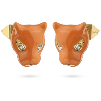 Изготовлено из ювелирного сплава на основе латуни с гальваническим покрытием золотом. Изделие покрыто эмалью оранжевого цвета и украшено белыми кристаллами SW. Размер украшения 1.5х1см. Застежка-гвоздики.