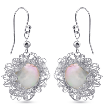 Изготовлено из ювелирного сплава на основе латуни с гальваническим покрытием родием. Изделие украшает перламутр белого цвета. Размер серьги 5х2.5см. Застежка-крючок.