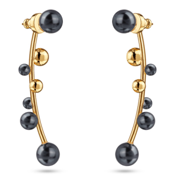 Изготовлено из ювелирного сплава на основе латуни с гальваническим покрытием золотом. Изделие украшает жемчуг Майорка темно-серого цвета диаметром 4-8мм. Длина серьги 5см. Застежка-гвоздики.
