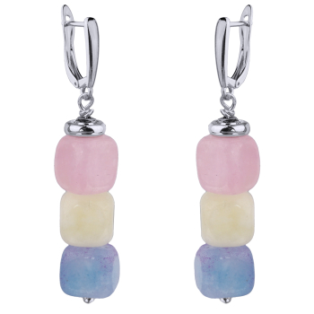Изготовлено из ювелирного сплава на основе латуни с гальваническим покрытием родием. Изделие украшает кварц цвета карамельный микс диаметром 7-8мм. Длина серьги 4см. Английская застежка.